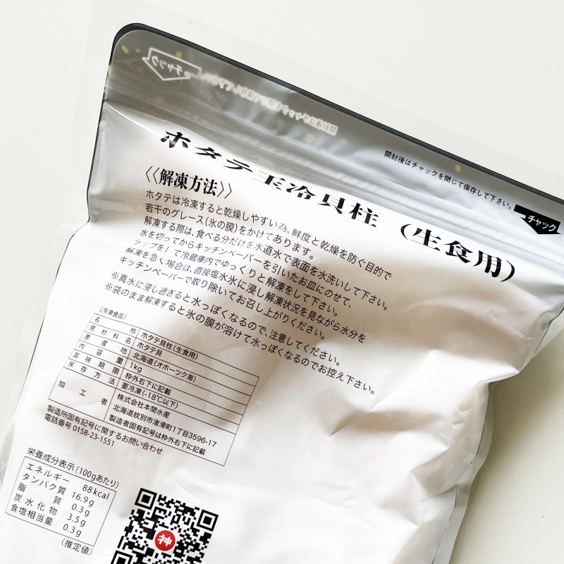 北海道紋別市のふるさと納税人気返礼品「北海道オホーツク海産ホタテ玉冷大(1kg)」。今までに20,000件以上のレビューがあり、星5つが大半を占める、リピート率の高い超人気商品。筆者がはじめてのふるさと納税で返礼品に選んだのがこの帆立で、毎年リピートするほどお気に入りです。身が大きく、甘くてプリプリの帆立は、お刺身、フライ、炊き込みご飯、カレーなど楽しみ方は色々ですが、一番のおすすめはバター焼きです。薄い水で加工されているので袋から取り出しやすく、チャック付きの袋なので、しっかりと密閉保存できるのも便利です。