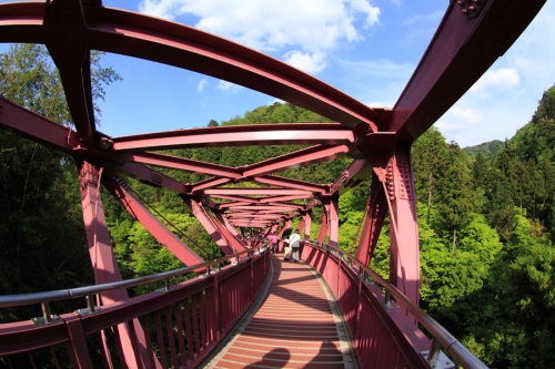 鶴仙渓に架かる総ひのきづくりの”こおろぎ橋”は山中温泉を代表する名勝地で、フジテレビ系の昼ドラ『はるちゃん』の舞台になったことで一躍名前が知られるようになりました。総ひのきづくりの”こおろぎ橋”に対して、S字型のユニークな紅紫色の橋は”あやとりはし”。ここから眺める鶴仙渓の景色が素晴らしく、山中温泉の新名所として人気を集めています。