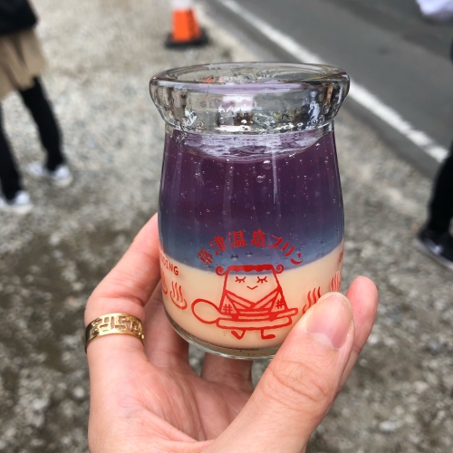 草津温泉の定番食べ歩きグルメといえば、温泉たまご。湯畑に面した場所にあるお漬物店「頼朝」では、温泉たまごを1個から購入でき、温泉たまごとだし汁、スプーンがセットになっていて食べ歩きに便利です。湯畑のエメラルドグリーンをイメージしたジュレがのった、「草津温泉プリン」の湯畑プリンも新定番として話題になっています。