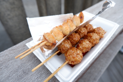 このほか水産加工品を取り扱う「徳造丸 箱根湯本売店」の、アワビ丸ごと串焼きにしたあわび串や、伊豆・下田近海でとれた金目鯛が入った焼きおにぎりもおすすめ。