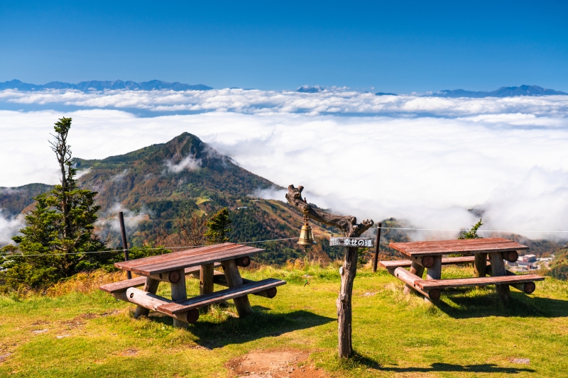山頂には、「2307満天ビューテラス」という展望デッキがあり、お天気の良い日には富士山から北アルプス、さらには日本海の向こうにある佐渡島も見えることがあるとか。長野は高い山が多く、展望スポットもたくさんあるため、比較的混み合うことが少ない穴場的な絶景ポイントです。