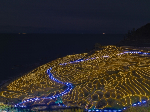 稲刈りが終わった10月中旬から3月の上旬ぐらいまで開催されるイルミネーションイベント『あぜのきらめき』は、1004枚の小さな田んぼのあぜ道に、ボランティアの人たちが光を植えていったもの。