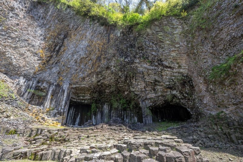 およそ160万年前の火山活動によって流れたマグマが冷えかたまって、六角柱の形に割れ目(柱状節理といいます)ができ、それが河川の侵食で姿を現した結果、このような不思議な光景ができあがりました。洞窟自体は江戸時代からの採掘によってできた人工のものです。