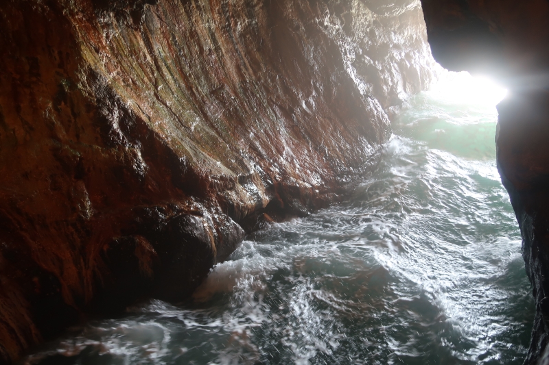 その「三段壁」の地下36mには、波浪による侵食で海食崖に形成された「三段壁洞窟」が広がっており、入場料を払うと、エレベーターで降りて洞窟内を200m周回することができます。