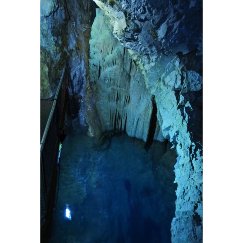 総延長が約1km、水深40m。洞内は一年中16℃に保たれ、夏は涼しく、冬は暖かく感じます。吸い込まれてしまいそうなエメラルドグリーンの透明度の高い泉や、神秘的な「名残りの池」など、見どころがたくさんあります。