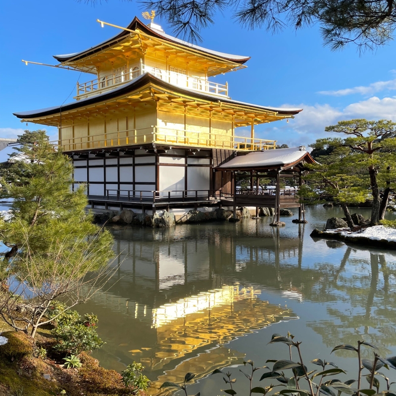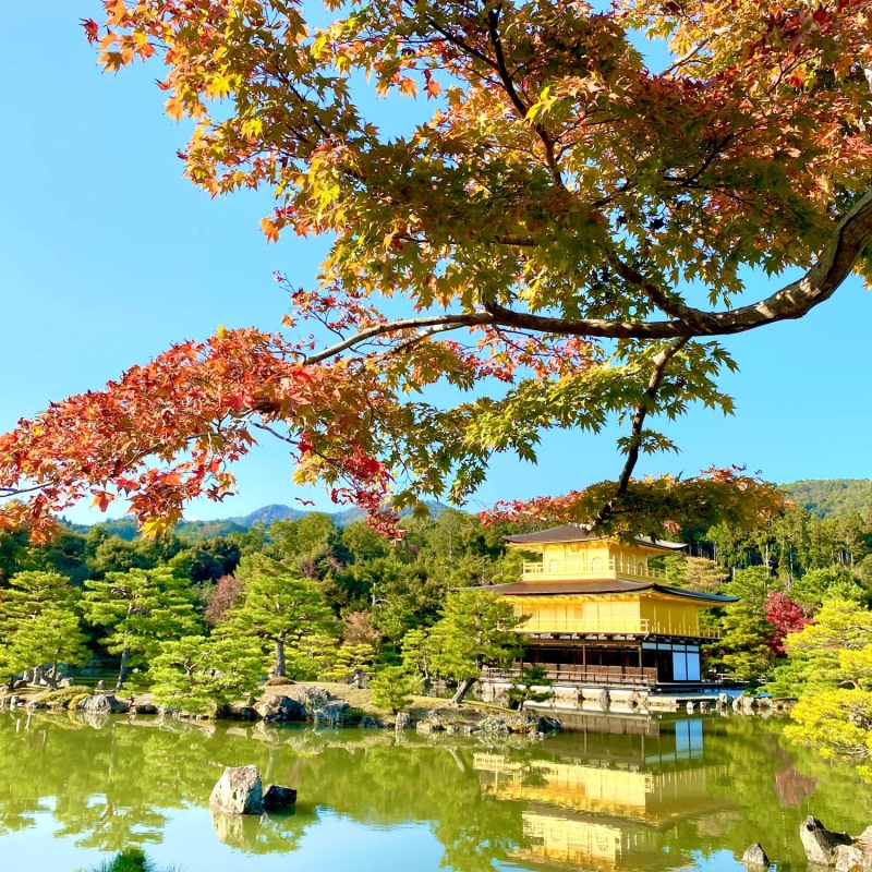 現在の金閣寺は昭和25年(1950年)の火災で焼失したものを再建したもの。昭和62年(1987年)には金箔の張り替えが行われ、美しく輝く金閣寺が姿を現しました。境内の半分以上を占める庭園は特別史跡・特別名勝に指定されており、鏡湖池(きょうこち)に映る金閣寺の姿は一見の価値があります。
