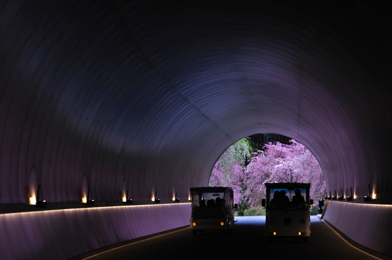 レセプションから展示棟までは歩いて5〜10分ほどの道のり。途中にトンネルがあり春にはトンネルからしだれ桜の美しい姿を望めます。