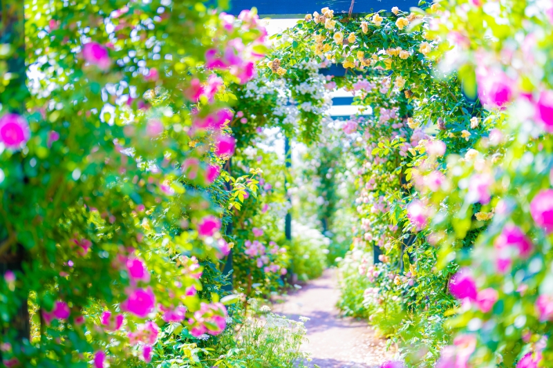 熱海の海を一望する斜面に12種類のガーデンが点在し、世界各国のバラやハーブを楽しめる花の楽園。早春には菜の花やあたみ桜が、5月下旬から6月上旬にかけては、約600種4,000株のバラが咲き誇ります。