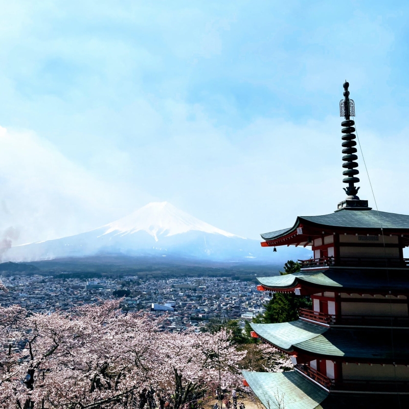 新倉山の中腹にある「新倉山浅間公園」は、”これぞニッポン!”という絶景が楽しめる公園です。五重塔(忠霊塔)と富士山、そして春には桜、秋には紅葉と、まるで絵ハガキのような絶景を眺めることができます。忠霊塔は22時までライトアップされ、夜には妖艶で美しい景色に様変わりします。