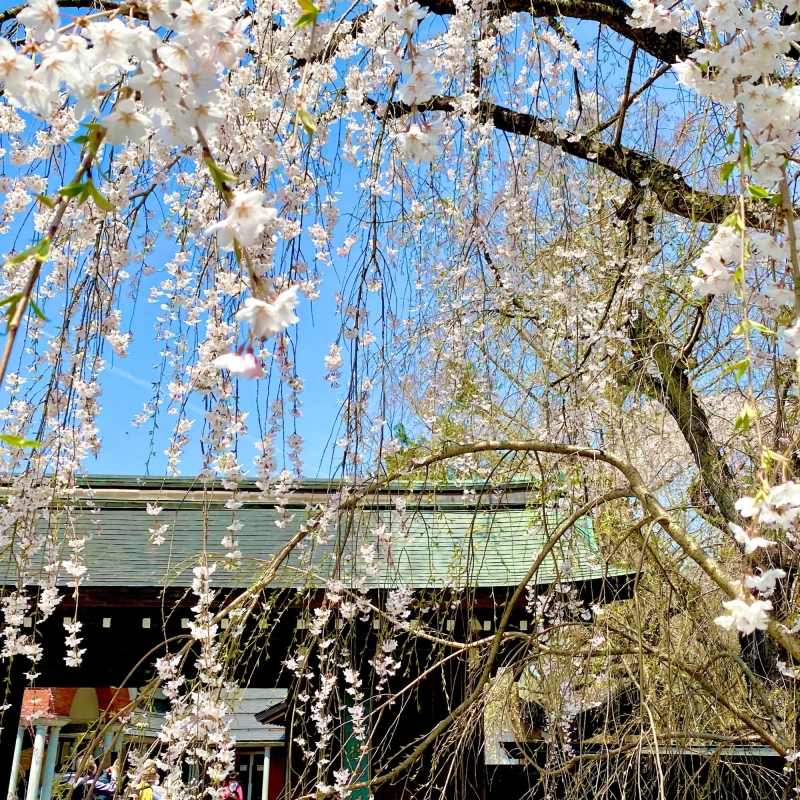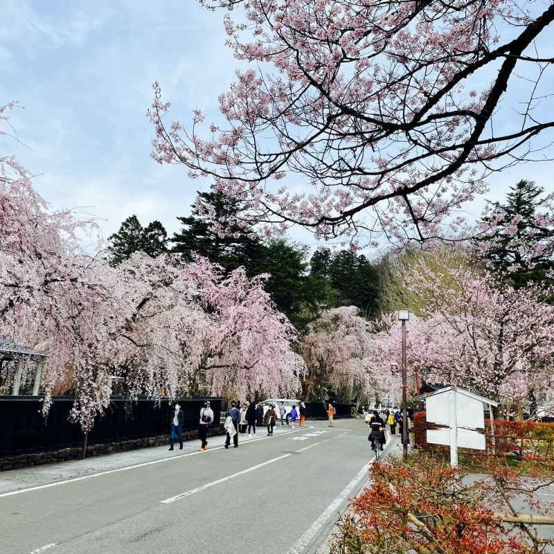 一帯は桜の名所としても知られ、4月下旬〜5月初旬にかけての開花時期には、枝垂れ桜のピンクで通りが華やかに彩られます。一人旅でしっとり観光するのにおすすめのシーズンです。