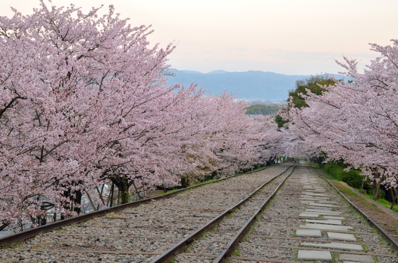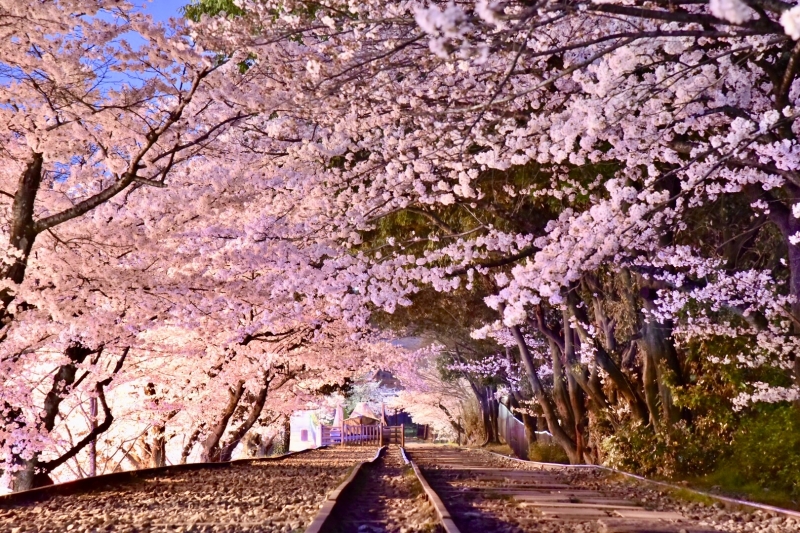 特に春、線路沿い植えられた約90本の桜が見頃を迎える時期には、線路に降り注ぐように咲き誇るピンク色の桜と線路が織りなす光景が絶景です。桜のアーチをくぐりながら映画の主人公になった気分で散策ができますよ。
