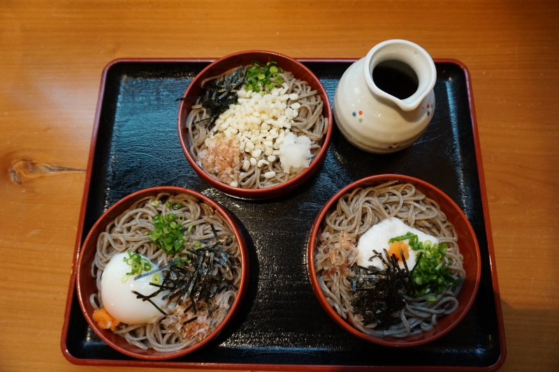 定番の割子そばは、重箱のように丸い3段の漆器に割子そばが盛り付けられた「三色割子」。1段ごとに薬味やトッピングが異なり、温泉たまご、とろろ、大根おろしと天かすが、それぞれ盛り付けられています。もう一つの定番メニュー「釜あげそば」は、茹で上げられたおそばが蕎麦湯ごと器に盛り付けられており、そばつゆを上からかけていただきます。