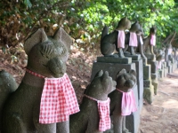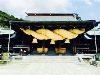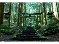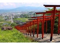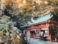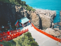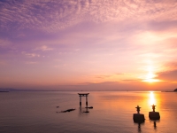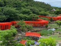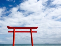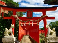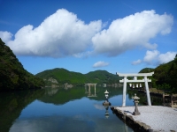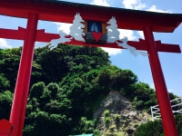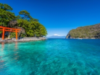 森戸神社の鳥居と裕次郎灯台、背後に富士山