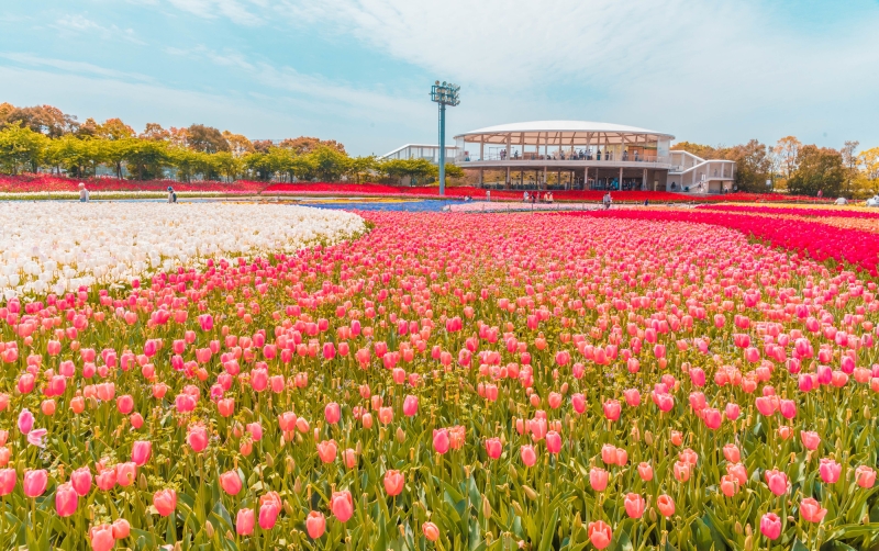 東京ドーム約40倍の広大な面積をもつ緑のオアシス。四季折々のさまざまな花が咲き誇り、春は桜、菜の花に続いて4月中旬に圧巻のチューリップ畑が登場します。