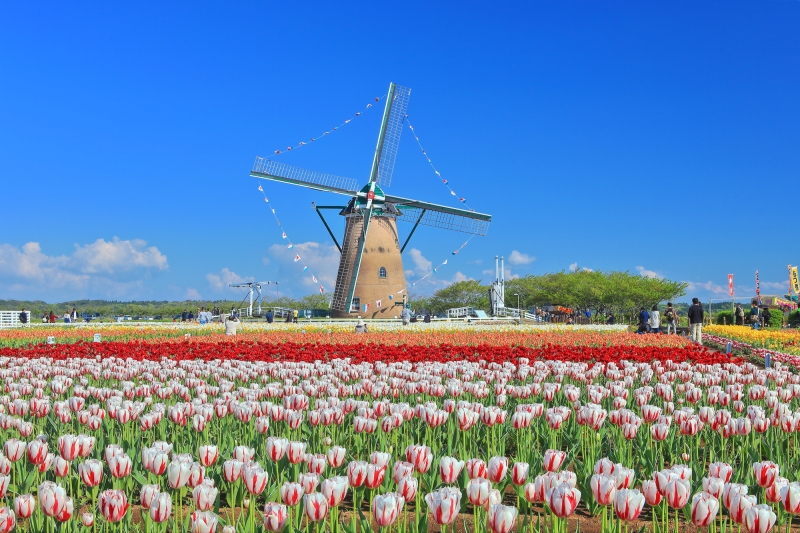 オランダ風車「リーフデ」が印象的な「佐倉ふるさと広場」。春には関東最大級となる100種類、約72万本の色とりどりのチューリップが咲き誇り、風車とチューリップ畑の光景は本当にオランダにいるかのよう。