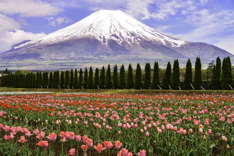 チューリップが見られるのは、例年4月下旬~5月上旬にかけて。雄大な富士山を背景に、カラフルなチューリップ畑が広がる様子は春の訪れを実感させる風景です。