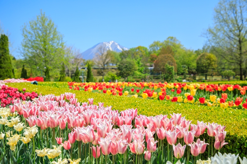 総面積が50haもある日本最大級のフラワーパーク。鳥取県が誇る秀峰・大山を望む園内は四季折々の花々で彩られ、例年4月には約230品種20万球の色とりどりのチューリップが咲き誇ります。