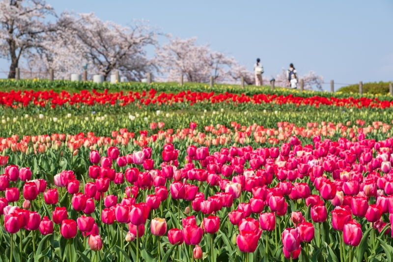 なかでも人気は”世界一美しい”とのキャッチコピーがついた「桜とチューリップの庭園」。例年3月下旬〜4月中旬にかけて、60万球の色とりどりのチューリップと、1,300本もの桜との競演を楽しむことができます。