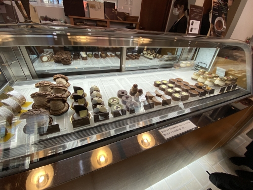 タブレットの豊富さはもちろん、ケーキケースの中も全てがチョコレートケーキ!フォンダンショコラは、カカオ濃度によって数種類の中から選ぶことができます。