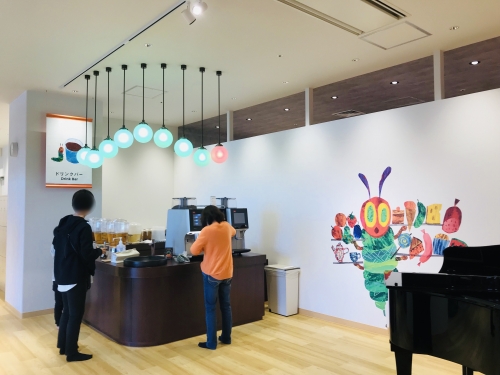 カラフルなソファでドリンクを飲みながら、エリック・カールの絵本を読んでくつろぐことができます。