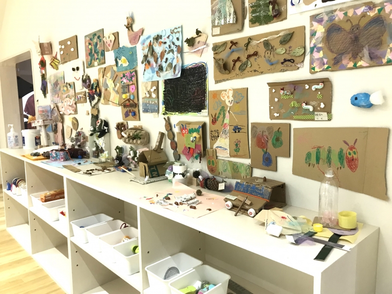 工作道具や色々な材料があり、好きに取って、好きに使って、好きに創れる空間です。材料としては、紙はもちろんのこと、自然の中から拾ってきたどんぐりや松ぼっくりもありました。作った作品は、題名と名前を書いて飾ってもらうこともできるようです。