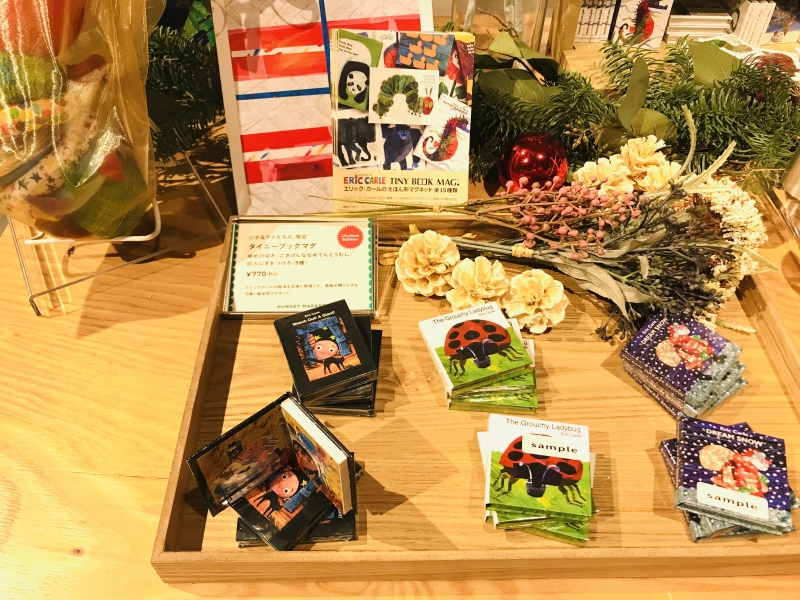 注目は、ここでしか買えない「タイニーブックマグ」(税込770円)。エリックカールの絵本を忠実に再現した、表紙が開く小さなかわいい絵本型マグネットです。