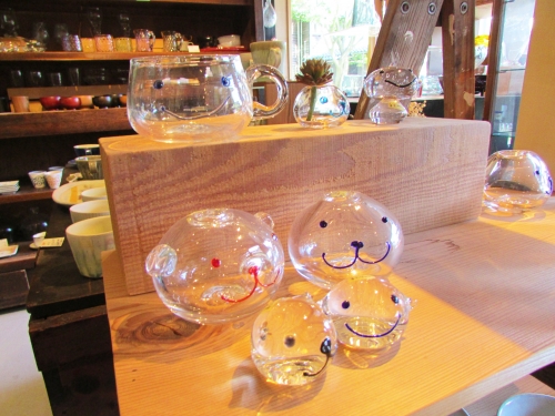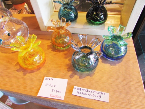 「家族を笑顔にするガラス」のコンセプト通り、ほっこりする作品やくすっと笑える作品、キラキラと美しい作品が所狭しと並ぶ店内。その中でも特に珍しい作品が、ガラスの鏡餅です。