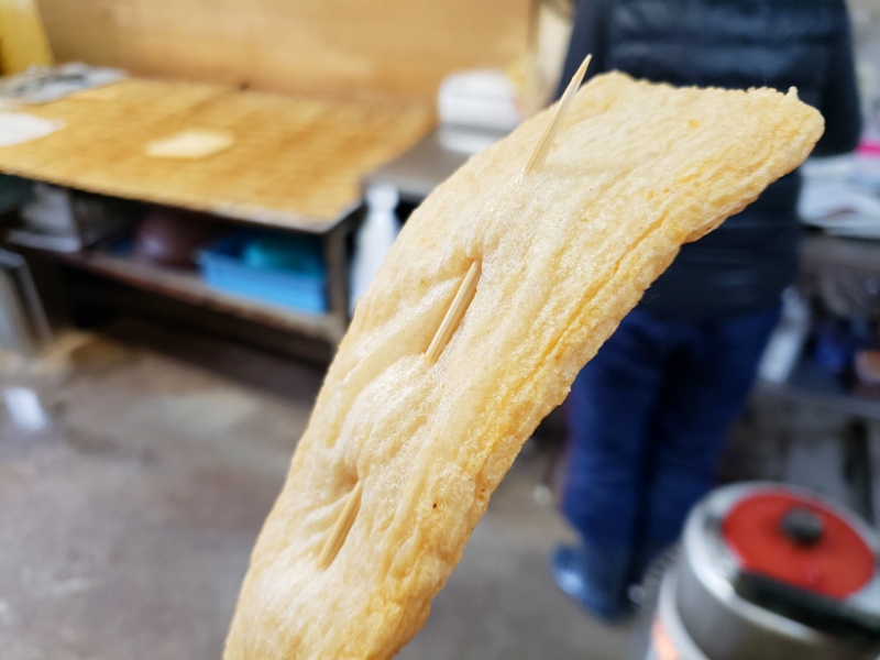目の前で揚げた天ぷらを串に刺してその場で試食させてもらえます。