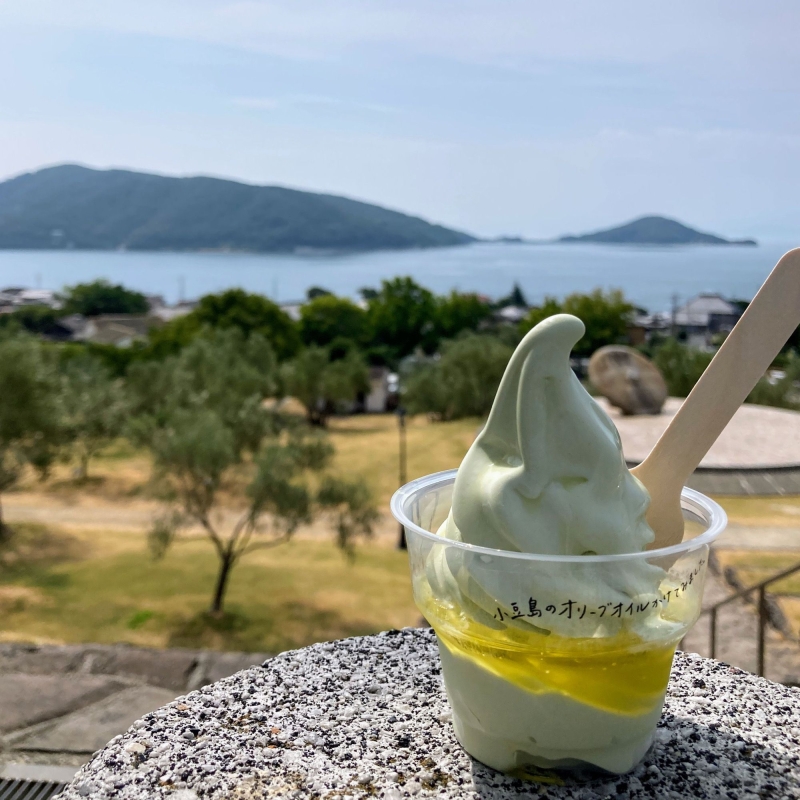 さわやかなライトグリーンが目を引くソフトクリームで、たっぷりと特産のオリーブオイルがかかっています。甘さの後にふわっとオリーブの香りとオイルの爽快感ある味わいが広がり、想像以上の美味しさですよ。