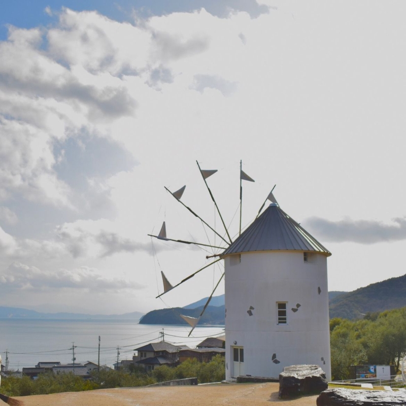 瀬戸内海を見下ろす小豆島の小高い丘に広がる「道の駅 小豆島オリーブ公園」。園内には、約2,000本のオリーブの木やハーブガーデン、ギリシャ風車、温泉、ショップ、カフェなど様々な施設が集まります。映画『魔女の宅急便』や『ぼくとママの黄色い自転車』などのロケ地としても使用されました。