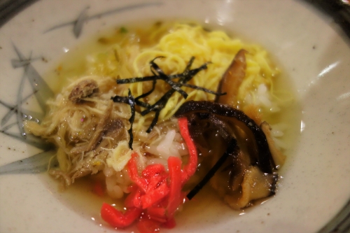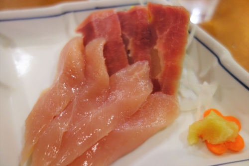 ひさ倉のけいはん(¥1,210)は、自営の養鶏場で育てた鶏肉を使用し、放し飼い地鶏からダシをとったスープで、コクがありながら、さっぱりしているので、永遠にお代わりができそうな気分。タンカンの皮の薬味が爽やかで、食欲を刺激されます。また、養鶏場直営だからこそできる、鶏のお刺身(¥550)の追加は地元民イチオシのメニューです。