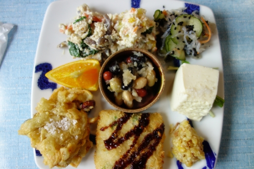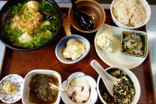 今回注文したのは、揚げ出し豆腐定食(¥1,150)と盛り合わせちょこちょこ。こだわりのお出汁がしみ込んだ揚げ出しも大満足ですし、色々な豆腐づくしを満喫できる、ちょこちょこもお勧めです。店内では島豆腐や島豆腐を使用したスイーツも販売しています。