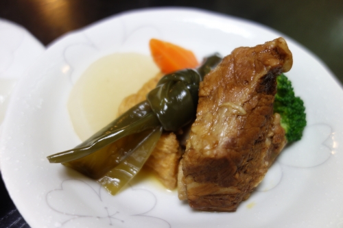 こちらでは、島料理と島唄が楽しめる、おまかせコース(¥4,000ワンドリンク付き)が、おすすめです。季節や仕入れによって変動はあるようですが、この日は、奄美の食材三種盛りの奄美のもずく、とびんにゃ(飛び貝)、クルマエビの塩焼き、生節とつきあげ(さつまあげ)と粒味噌の和え物、ハンダマ(奄美の伝統的野菜)のゴマ和え、油ソーメン、豚骨と島野菜の炊き合わせに、ご飯とアオサの汁物がつきました。