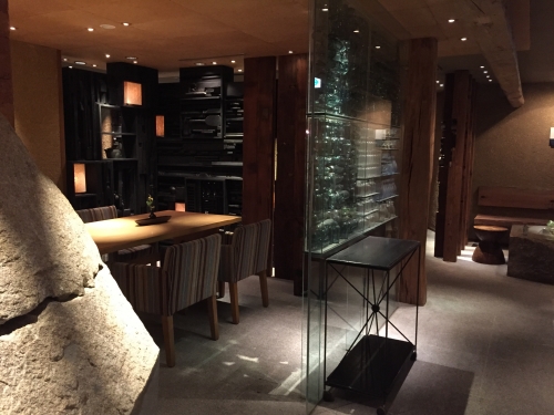 本館と石蔵の中間地点にある吹き抜けの空間。こちらには、大きな石の中に植物が飾られており、壁には時計のような飾りとベンチがあります。