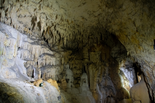 鹿児島県天然記念物に指定されている鍾乳洞です。全長3,500mのうち600mが観光用に一般に公開されており、特別な装備がなくても中に入ることができます。鍾乳石の発達が素晴らしく、流れる水の様に見えるフローストーンは全国最大級です。
