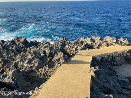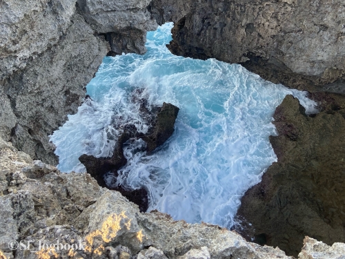 フーチャとは、島の言葉で潮吹き上げ洞窟を意味します。海岸線付近の断崖あり、隆起サンゴ礁が荒波で浸食されてできた縦穴型の洞窟です。季節風や台風のときには20~70mも潮が吹き上げます。棘のような岩場が広がる断崖絶壁には手すりなどがありません。動きやすい靴で、十分注意しての鑑賞が必要です。