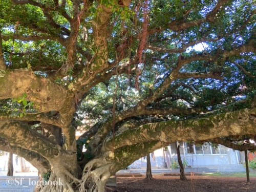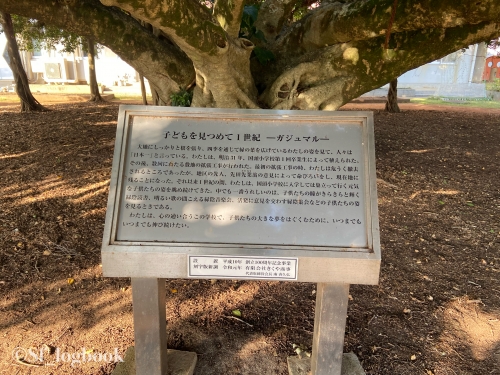 国頭小学校の校庭に立つ、樹齢120年を超える大きなガジュマルの木です。1898年に同校の第一回卒業生たちにより植樹され、今の子どもたちの成長を見守っています。小学校が開いている時間であれば、見学することができます。