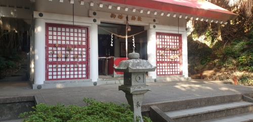 駐車場から岬の展望台までは、徒歩20分ほど。多少距離はありますが、整備された道を歩くのでサクサク歩けます。岬にいく道中に、御崎神社がありますので、ぜひお参りを!