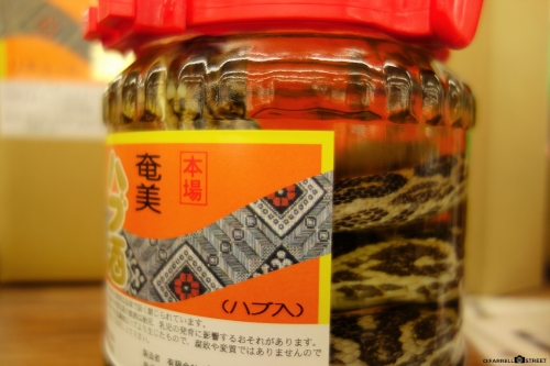 奄美大島には、猛毒を持つハブが、なんと25万匹も生息していると言われています。夜行性ですが、どこにいてもおかしくないらしいので、気をつける必要があります。筆者は、会わずにすみましたが、思わぬところで出あってしまいました。スーパーのお土産コーナーです。焼酎に浸かったハブではなく、生きたハブに会いたい方は、「原ハブ屋奄美」で、ハブのパフォーマンスショーが見られます。