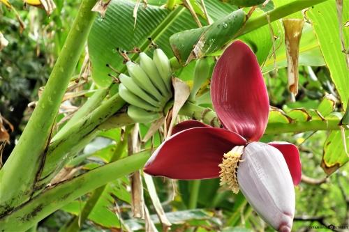 同じく砂浜の足元で咲いているのがグンバイヒルガオ。葉の形が相撲の軍配に似ていることから名前がついています。花の色は薄紫色で、可憐な花です。バナナと同じバショウ科の植物糸バショウは、バナナの実に見えますが、種が多く食用にはむかないそうです。戦前までは、バショウから採れる繊維で芭蕉布を織っていました。