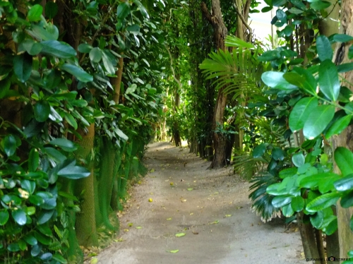 国直集落のパワースポットとして有名なフクギのトンネル。フィリピン原産でオトギリソウ科の常緑木です。2枚の葉が揃っていることから、夫婦円満のご利益があるなど人気の場所となっています。