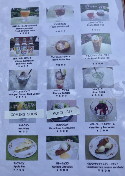 コーヒー(¥600)など定番ドリンクの他に、鎌倉サイダー(¥600)、鎌倉ビール(¥800)や、鎌倉ソーセージ・有機ポテトのオーブン焼き(¥1,200)など鎌倉観光にぴったりのメニューも。