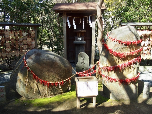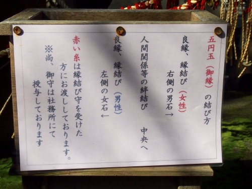 まずは社務所で赤い糸の付いた五円玉を授与してもらいます。縁結び石の赤い紐に五円玉を結び付ければ、神様との縁が結ばれご利益があるとされています。