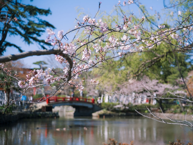 境内にはいって正面に見える太鼓橋を挟んで右側に源氏池、左側に平家池があり、このふたつをあわせて源平池と呼びます。春には桜、夏にはハス、秋には紅葉と、季節によってさまざまな景色を見せてくれます。
