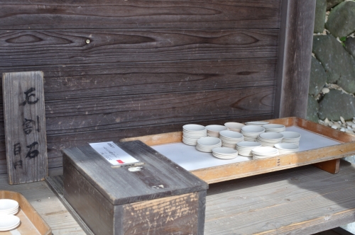 鎌倉宮で大人気なのが、厄除けの盃割り舎。厄除け料の100円をお納めして盃を手に取り、盃に大きく息を吹きかけたあと石めがけて「えいやっ!」という感じで投げます。石に盃を投げつけて粉々にすることで、体の中にある悪いものが祓われると伝えられているんですよ。