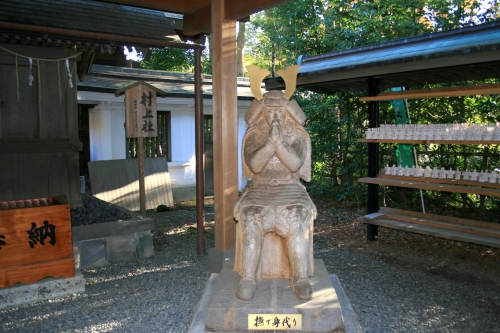 また拝殿のとなりには村上彦四郎義光を祀った村上社があり、「撫で身代り」が置かれています。村上彦四郎義光は、元弘3年(1333年)に鎌倉宮の御祭神である護良親王の身代わりとなり亡くなった武将で、身体の悪い部分をなでると、身代わりとなり病を引き受けてくれたり、厄払いになるとのこと。