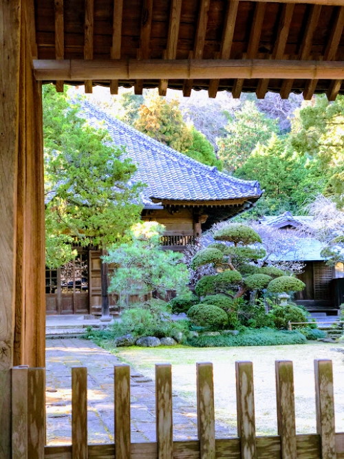 この「光明寺」、じつは鎌倉めぐりの途中で地元の方にすすめられて足を向けたお寺。敷地はかなり広く、あちこちにいくつもの建造物が点在しています。本殿(本堂)からお寺の中に入り回廊を通ると、「記主庭園」と呼ばれる庭を望むことができます。目の前には池があり、夏は美しい蓮の花に彩られるんだとか。回廊にはベンチも置いてあるので、のんびりと庭園を眺めながら過ごすのもいいかもしれませんね。