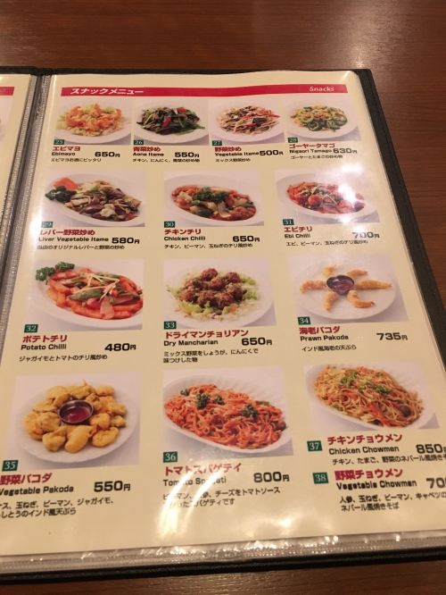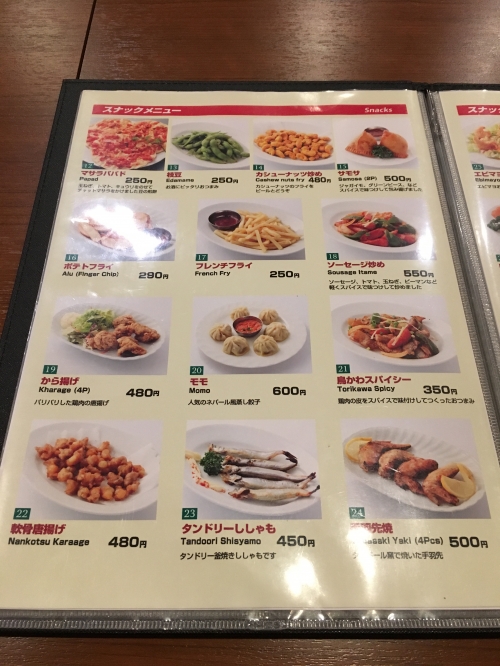 グリーンサラダ(450円)や枝豆(250円)やフレンチフライ(250円)など、一般的な居酒屋に置いてあるようなおつまみメニューもありますが、ネパールの蒸し餃子モモ(600円)や、インド風天ぷらの野菜パコダ(550円)等、エスニックなスナックも豊富に用意があります。