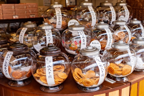 趣のある建物が並ぶ参道では、名物の草だんご、焼きせんべい、くず餅、飴、漬物、矢切の渡しもなか、どらやきなどが売られています。店の外からおだんごを作ったりおせんべいを焼いたりする様子も見え、参道を歩いているだけで楽しいです。