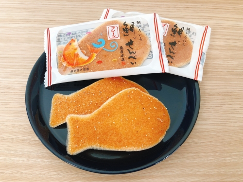 南房総のお土産として定番の「鯛せんべい」。大正時代から作られている歴史あるお菓子で、基本材料は砂糖・小麦粉・鶏卵、というシンプルな素材を使用しています。「おせんべい」という名から想像するものとは違い、歯ごたえがある堅めの食感で甘みも強めですが、ついつい手が伸びてしまう素朴な味わいです。